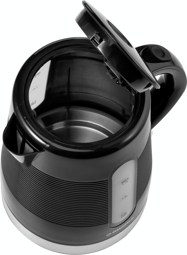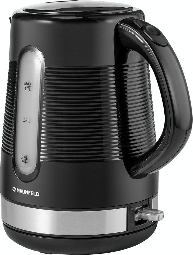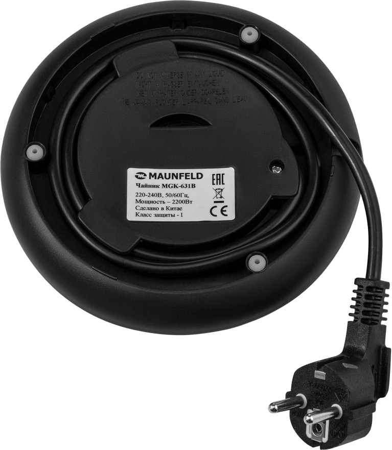 Электрочайник Maunfeld MGK-631B — компактный прибор с выразительным черным цветом и фактурной поверхностью корпуса.