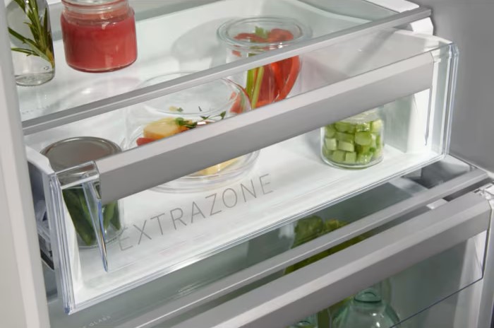 Вместительные контейнеры позволяют хранить достаточное количество овощей и фруктов. Для более длительного хранения и поддержания свежести овощей и фруктов разработаны специальные системы хранения. Среди них, например, зона свежести с увеличенной влажностью до 85% и температурой около 0 градусов. Это герметично закрывающийся ящик, часто на выдвижных роликах или направляющих, в котором имеется специальное задвижка, позволяющая регулировать влажность. Как известно, при более высокой влажности продукты с большим содержанием воды дольше остаются свежими.