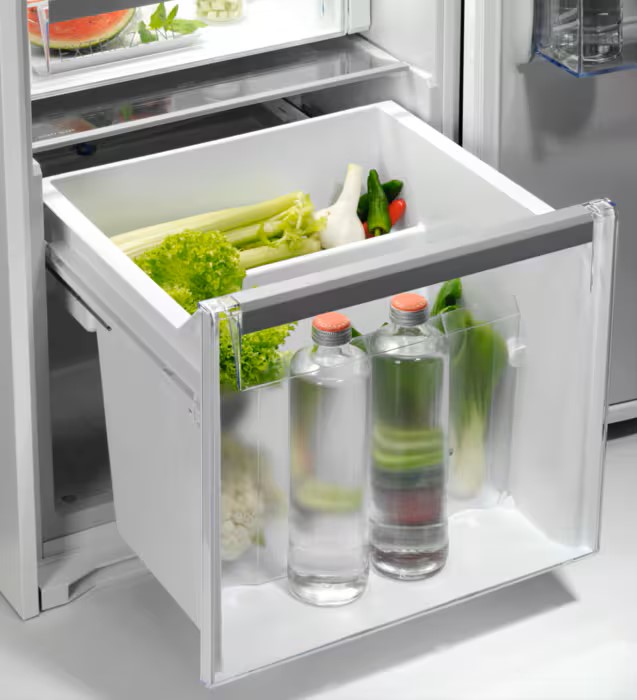 Ящики для овощей и фруктов можно найти в любой холодильной камере, какого размера ни был бы ваш холодильник — от большого устройства Side-by-Side до стандартной двухкамерной модели. В простейшем варианте они представляют собой обычные выдвижные ящики из пластика в нижней части камеры.
