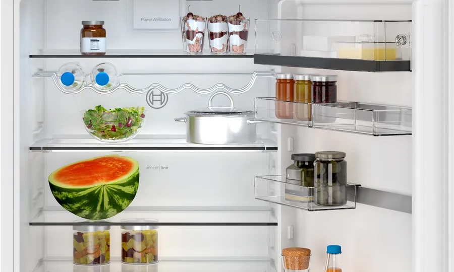 Регулируемые полки в холодильнике позволяют эффективно организовать хранение продуктов и облегчают их поиск в камере. Как правило, полки в холодильной камере изготавливаются из закаленного стекла, способного выдерживать большие нагрузки. Стекло является наиболее безопасным, прочным, нейтральным материалом, благодаря его прозрачности на полках можно легко отыскать любые продукты, а специальный бортик предохраняет устройство от протекания.