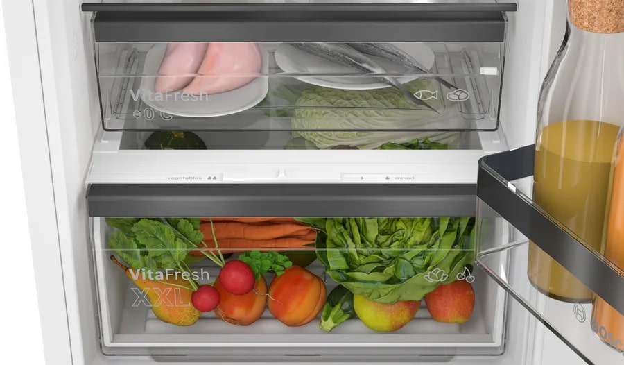 Зона свежести VitaFresh в холодильниках Bosch служит для увеличения срока хранения продуктов — от овощей и фруктов до свежего мяса и рыбы — без их заморозки. В ней поддерживается оптимальная температура около 0°C, а влажность в разных отделениях может регулироваться в зависимости от типа продуктов.