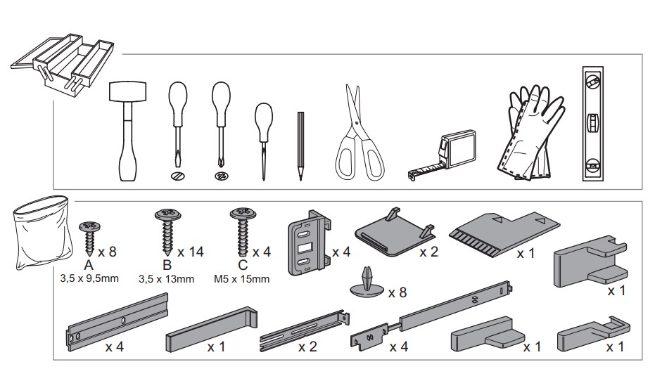 Металлические решетчатые полки используются чаще всего для размещения бутылок в горизонтальном положении. Пластиковые полки в настоящее время практически не используются, однако для удобного размещения продуктов могут использоваться пластиковые ящики — например, для овощей или фруктов, контейнеры и подставки.