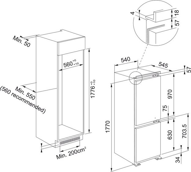 При всем сходстве с обычными отдельностоящими холодильниками частично встраиваемые модели имеют свои конструктивные особенности. Они связаны прежде всего с тем, что при встраивании необходимо обеспечить вентиляцию задней и боковых стенок, а также снизить уровень шума и вибраций. Как правило, проблема решается при помощи специальной системы вентиляции, когда вентиляционные решетки располагаются в нижней части корпуса холодильника.