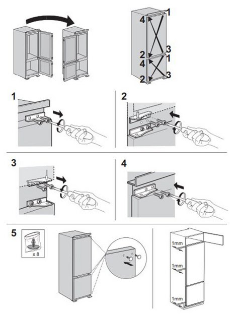 Встраиваемый прибор проще разместить в комнате, даже если общий метраж не такой уж большой. Вы можете спрятать его за декоративной панелью от мебельного фасада — советуем заранее определить нишу и заказывать панели исходя из типа крепления к двери. Способ монтажа в данной модели: скользящее крепление двери (система door sliding) Вы можете поменять направление открывания двери, так как упор переставляемый и ее можно перевесить на другую сторону. Такая функция открывает больше возможностей для установки. Холодильник с морозильником обладает всеми опциями, которые чаще всего ищут и выбирают покупатели. Стандартная конфигурация — универсальный вариант для любой квартиры. Количество камер: 2.
