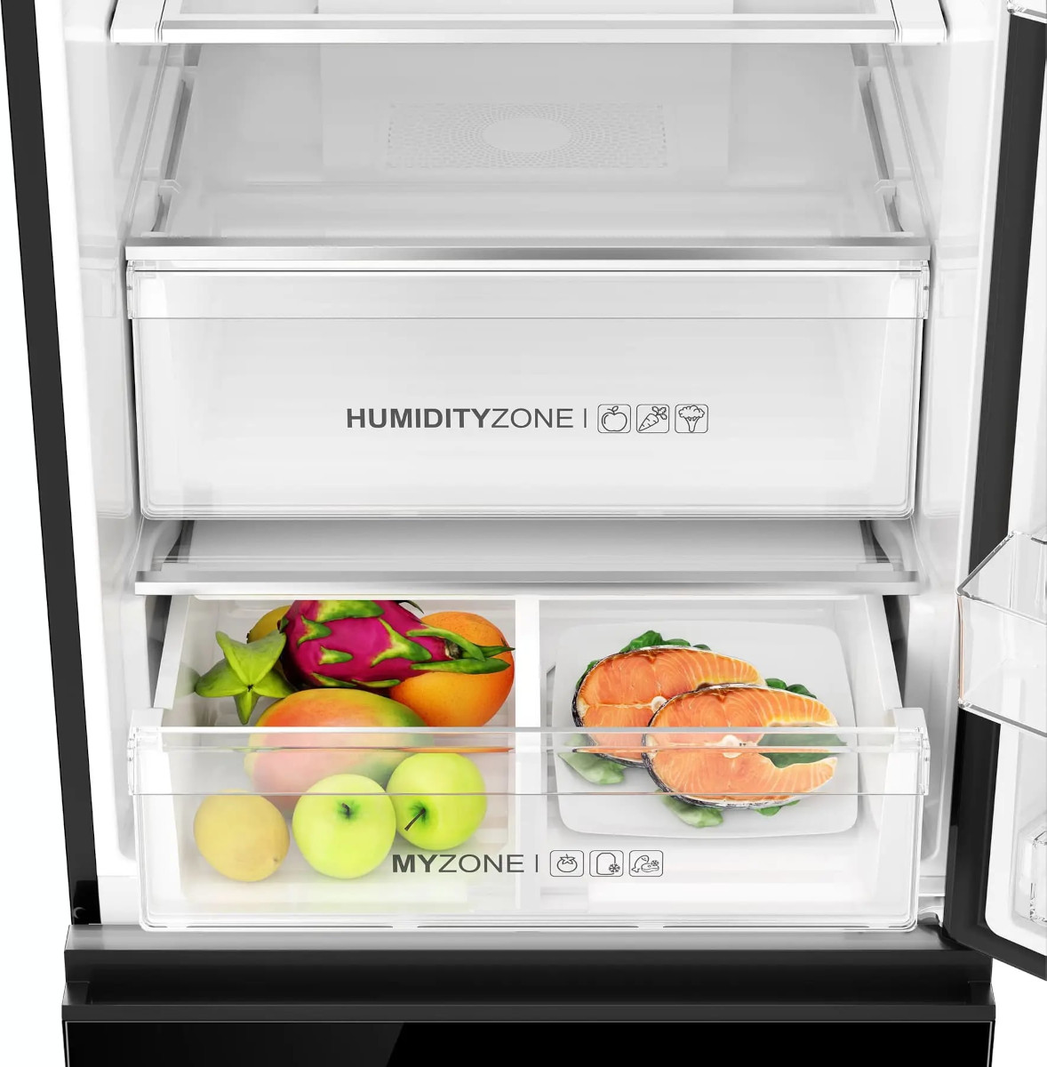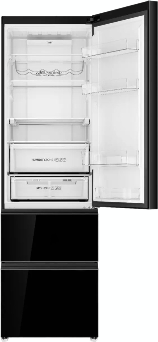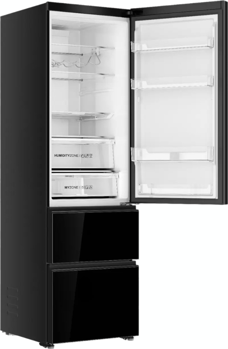 Удобство эксплуатации обеспечено продуманной внутренней компоновкой: общий полезный объём 388 л разделён на холодильную секцию 263 л, морозильник 103 л и зону свежести 22 л. Полки из закалённого стекла выдерживают тяжёлые ёмкости и легко очищаются, средняя полка может складываться, чтобы освободить дополнительное пространство. Внизу встроены два больших ящика для овощей и фруктов, один из них с контейнером HumidityZone и системой HCS — мембраной для регулировки оптимальной влажности. Такая конструкция помогает дольше сохранять хрустящую текстуру зелени и сочность фруктов.