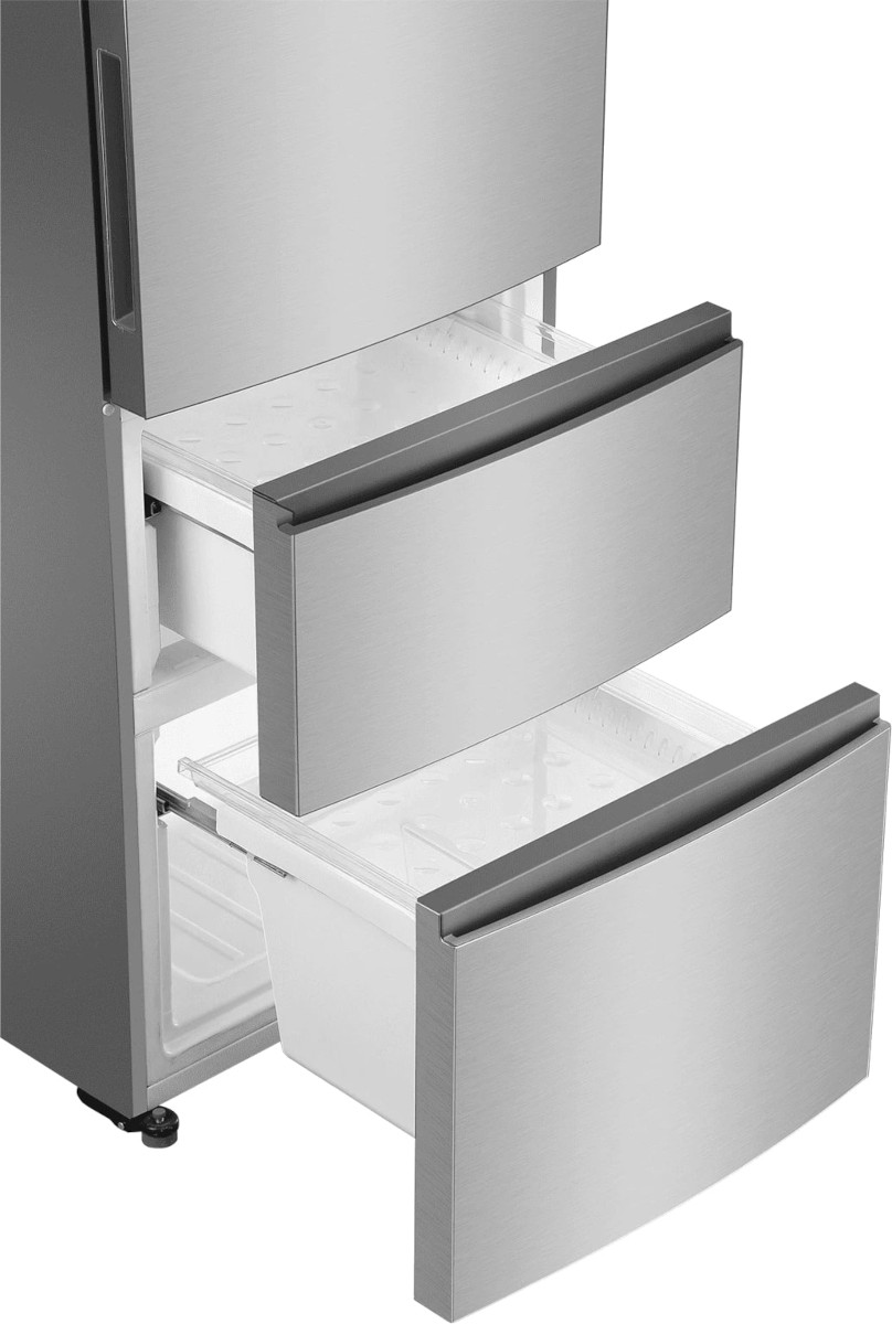 Трехкамерные модели выпускаются в нескольких вариантах. В некоторых случаях в качестве третьей камеры поступает так называемая зона свежести — отделение, где поддерживается температура около 0 градусов. В другом варианте подобные модели имеют морозильную камеру, состоящую из двух выдвижных ящиков.