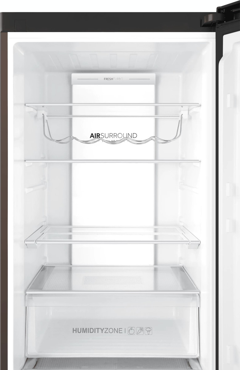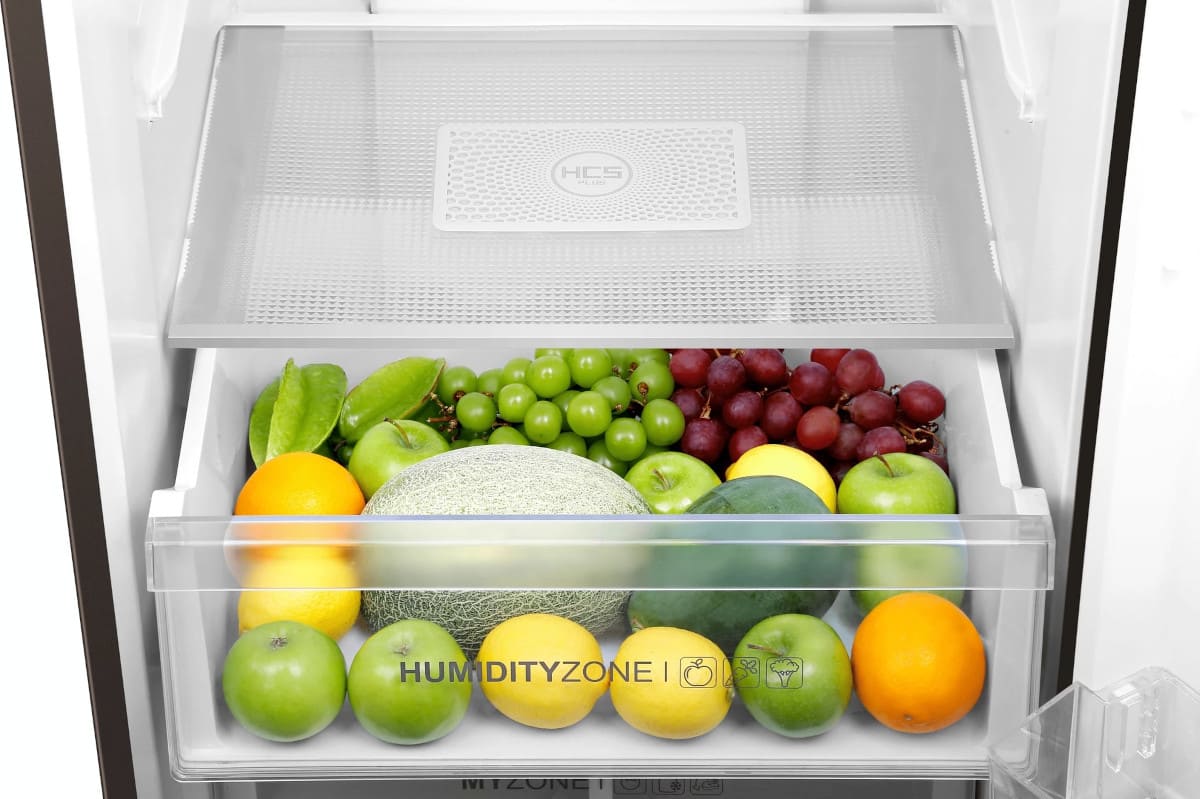 Внутреннее пространство организовано для удобства реальной семьи: общий полезный объем 389 л разделён на 286 л в холодильной и 103 л в морозильной части. Стеклянные полки выдерживают тяжёлые блюда и легко очищаются. В дверных карманах и отделении для бутылок найдётся место для разнообразных напитков. Зона свежести объёмом 22 л с двумя контейнерами и одной камерой HumidityZone позволяет контролировать влажность, что продлевает срок хранения фруктов и овощей.