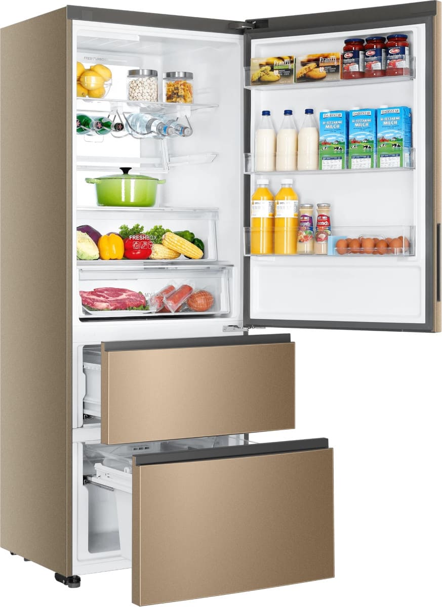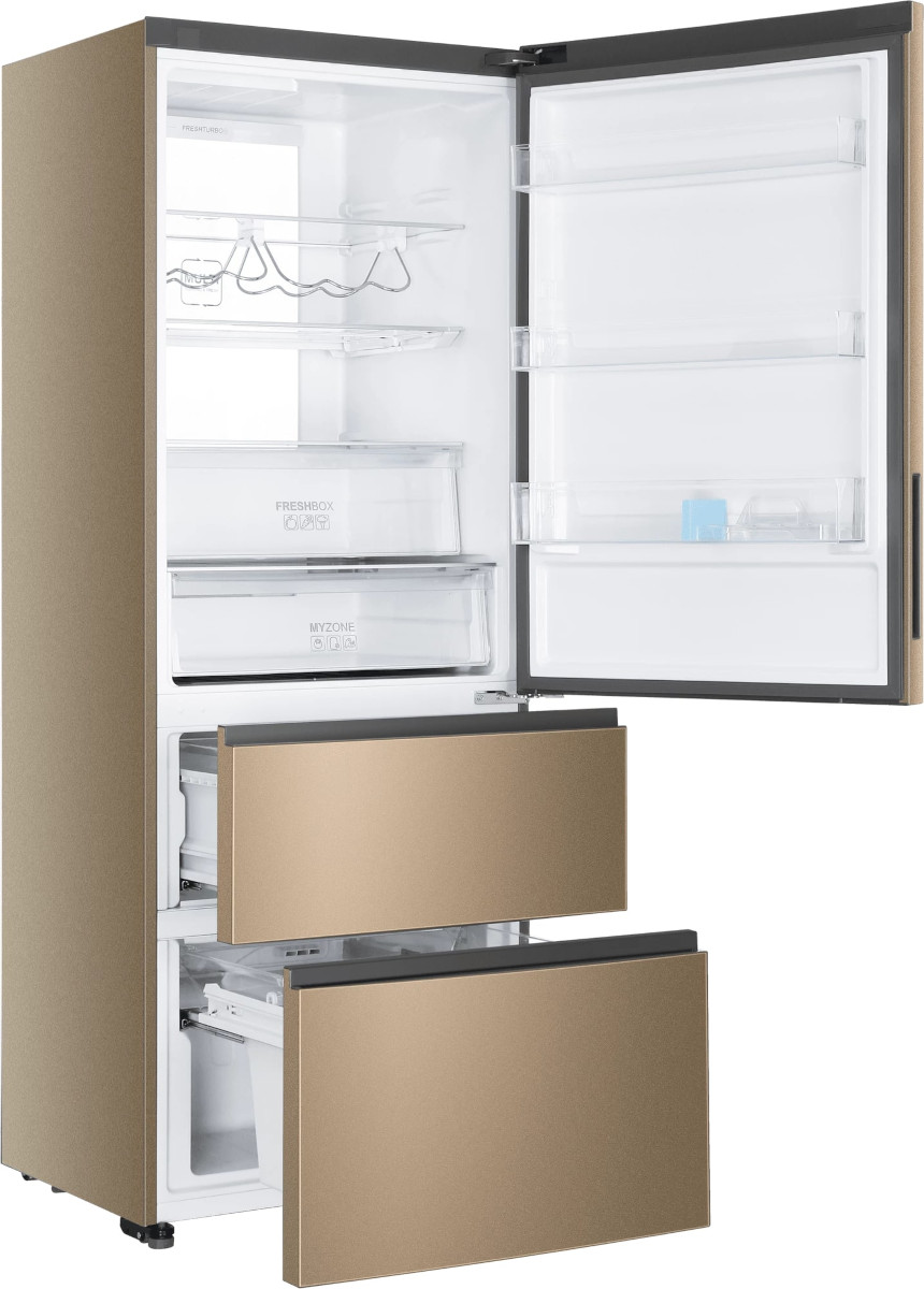 Трехкамерные модели выпускаются в нескольких вариантах. В некоторых случаях в качестве третьей камеры поступает так называемая зона свежести — отделение, где поддерживается температура около 0 градусов. В другом варианте подобные модели имеют морозильную камеру, состоящую из двух выдвижных ящиков.