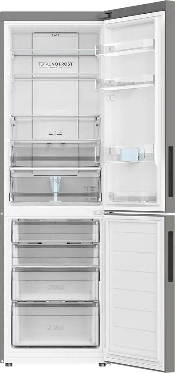 Внутреннее пространство рассчитано на семью: общий полезный объем 364 л, из которых 256 л отведено холодильной камере и 108 л — морозильной. Зона свежести на 21 литр с двумя контейнерами и системой контроля влажности помогает дольше сохранять овощи и зелень. Четыре стеклянные полки, складная средняя полка и четыре полки в дверце обеспечивают гибкость хранения. Для удобства есть большая овощная камера, подставка для яиц и яркое внутреннее освещение.