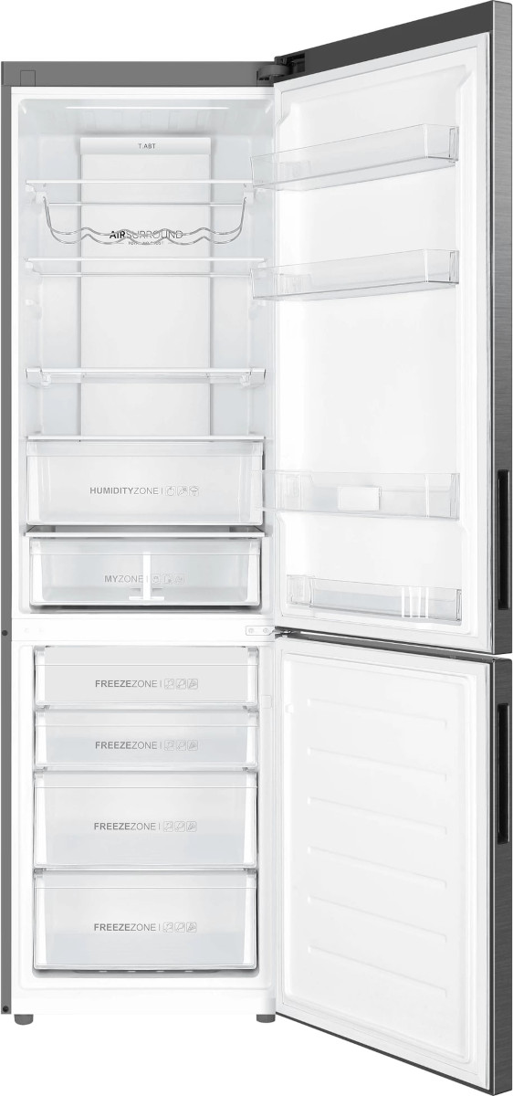 Внутреннее оснащение организовано для удобства повседневного использования: четыре стеклянные полки в холодильной камере выдерживают серьезную нагрузку и легко чистятся, средняя полка является складной и позволяет поместить в холодильник нестандартные емкости. Отделение для бутылок и четыре полки на дверце упрощают размещение напитков и соусов. Зона свежести объемом 22 литра с двумя контейнерами и системой контроля влажности HCS оптимальна для мяса и рыбы.