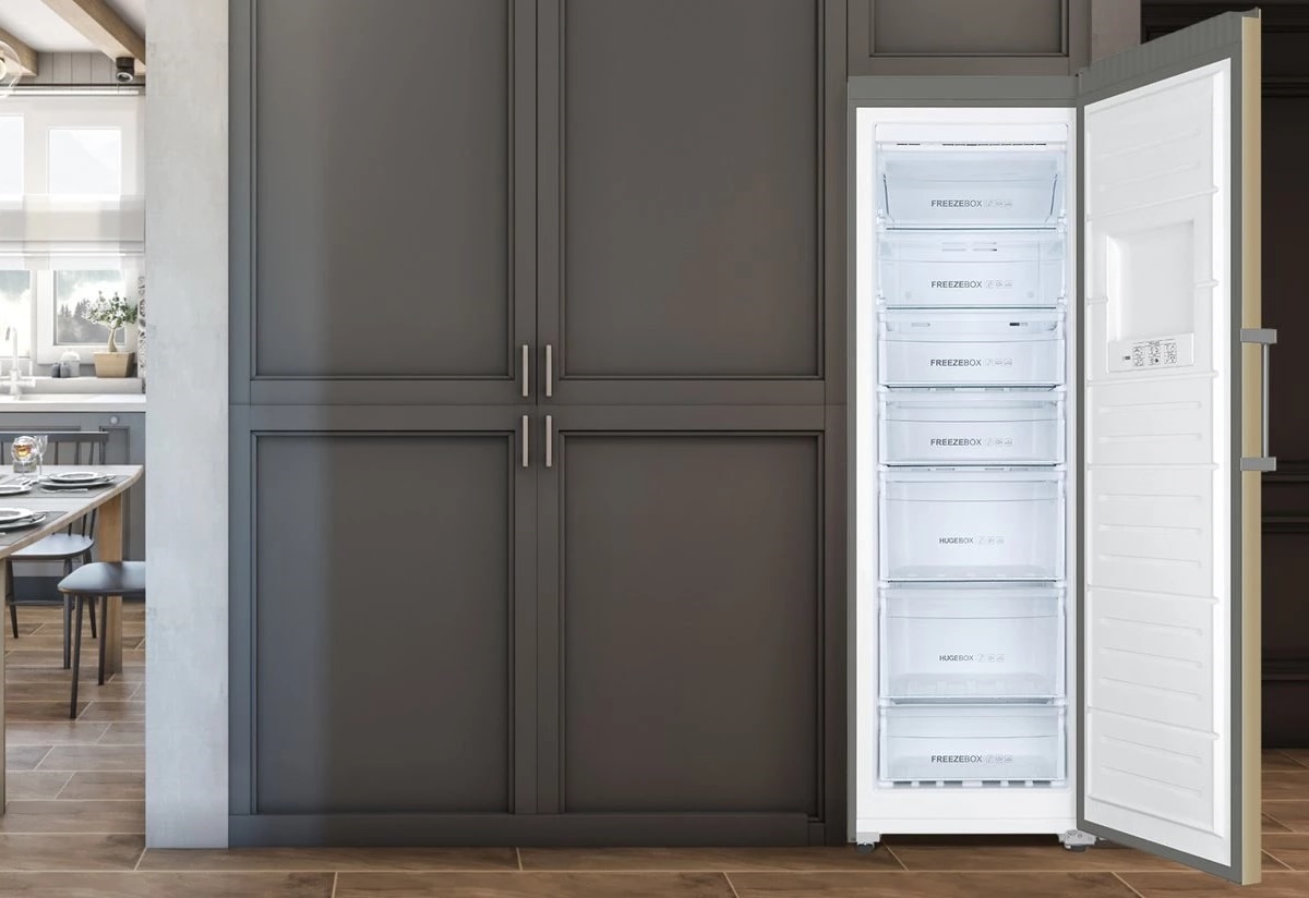 Внутреннее пространство рассчитано на 262 литра полезного объёма, распределённого по семи отделениям, что упрощает хранение разных типов продуктов. Ящики сделаны так, чтобы удобно было сортировать запасы по категориям и быстрому доступу. Наличие лотка для пиццы на дверце — практичное решение для хранения плоских заготовок и быстрой подготовки блюд к отправке в духовку.