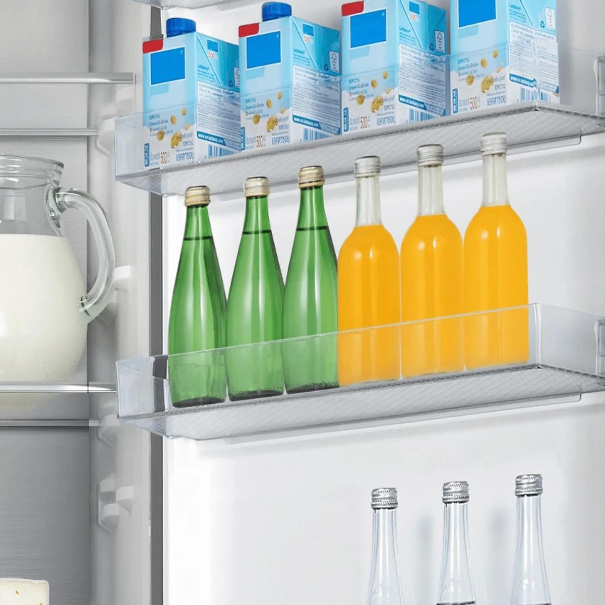 Полки на дверце холодильника позволяют значительно увеличить его вместимость, облегчают доступ к продуктам, особенно из таких категорий, как консервы, стеклянные банки, бутылки, в том числе молочные, яйца и многие другие. Как правило, на дверце холодильника может располагаться от 2 до 6 полок.