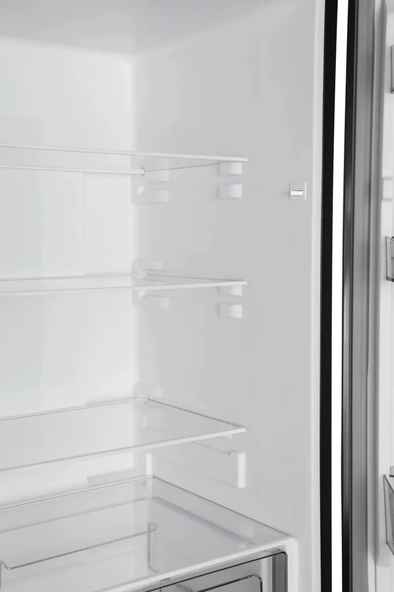 Данная модель — отдельностоящая, поэтому нужно тщательно подобрать место для ее размещения. Благодаря внушительным размерам, в частности высоте, она подходит большим пространствам — просторной кухне, еврогостиной. Вы можете поменять направление открывания двери, так как упор переставляемый и ее можно перевесить на другую сторону. Такая функция открывает больше возможностей для установки. Холодильник с морозильником обладает всеми опциями, которые чаще всего ищут и выбирают покупатели. Стандартная конфигурация — универсальный вариант для любой квартиры. Количество камер: 2.
