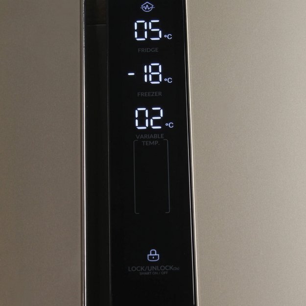 Гораздо точнее сориентироваться по индикаторам можно в холодильниках с электронной системой управления. Эти устройства обычно оснащены дисплеем, на котором высвечиваются значения фактической температуры в холодильной и морозильной камерах. Рядом с ними располагаются кнопки, во многих случаях сенсорные, при помощи которых можно регулировать температуру в каждой камере отдельно, и индикаторы включения этих камер. Здесь же, на панели инструментов, находятся индикаторы, указывающие на активацию дополнительных опций — например, режимов быстрого замораживания и быстрого охлаждения, отпускного режима, блокировки панели управления от детей.