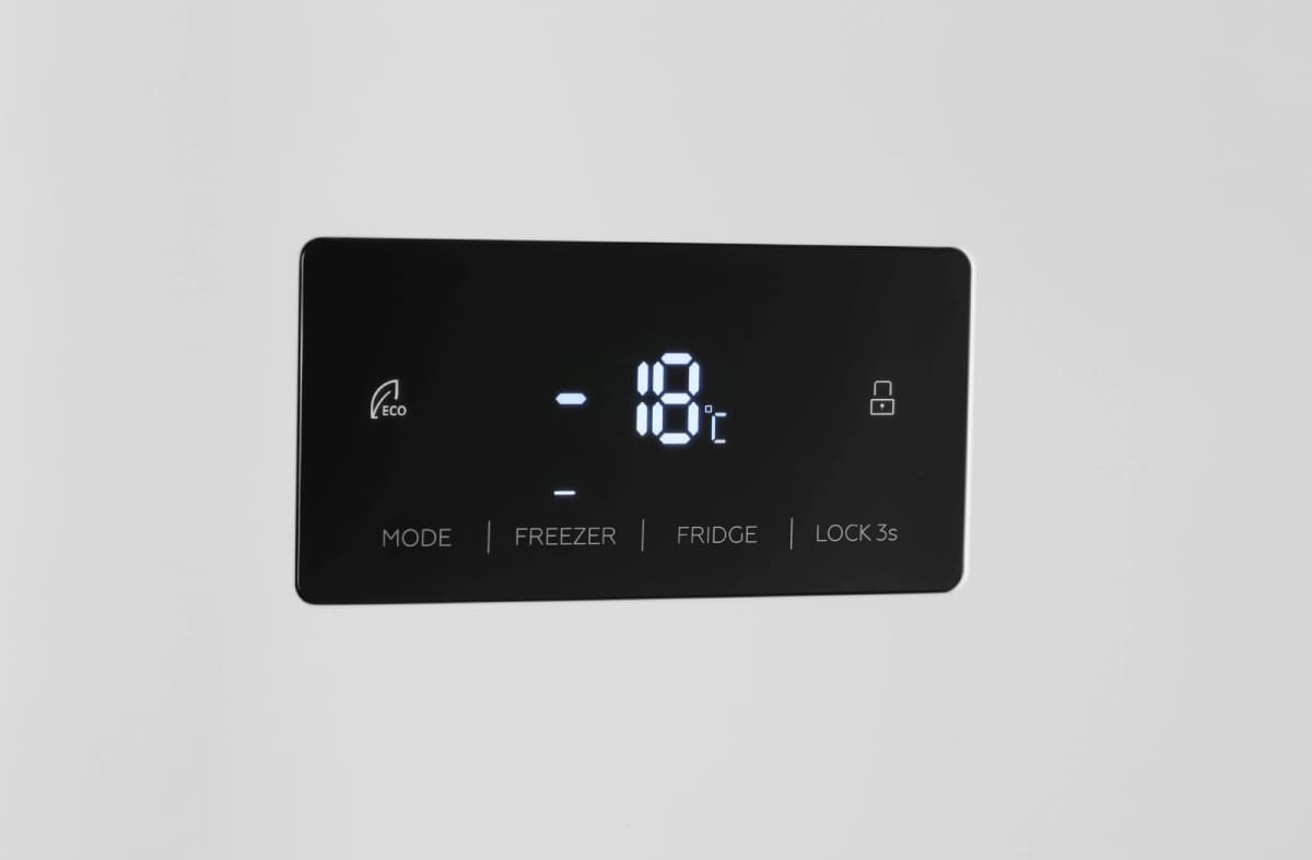 Гораздо точнее сориентироваться по индикаторам можно в холодильниках с электронной системой управления. Эти устройства обычно оснащены дисплеем, на котором высвечиваются значения фактической температуры в холодильной и морозильной камерах. Рядом с ними располагаются кнопки, во многих случаях сенсорные, при помощи которых можно регулировать температуру в каждой камере отдельно, и индикаторы включения этих камер. Здесь же, на панели инструментов, находятся индикаторы, указывающие на активацию дополнительных опций — например, режимов быстрого замораживания и быстрого охлаждения, отпускного режима, блокировки панели управления от детей.