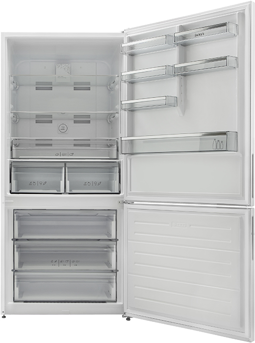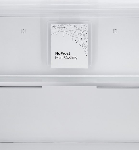 No Frost (Total No Frost, Frost Free): вентилятор обеспечивает циркуляцию охлажденного воздуха, благодаря чему лед не нарастает на стенке, а концентрируется только на скрытом внутри холодильника испарителе. Талая вода собирается в специальной емкости и испаряется. Такой холодильник не нужно размораживать – это экономит время и позволяет не останавливать прибор. Благодаря этим плюсам в современных моделях No Frost – самая распространенная система.
