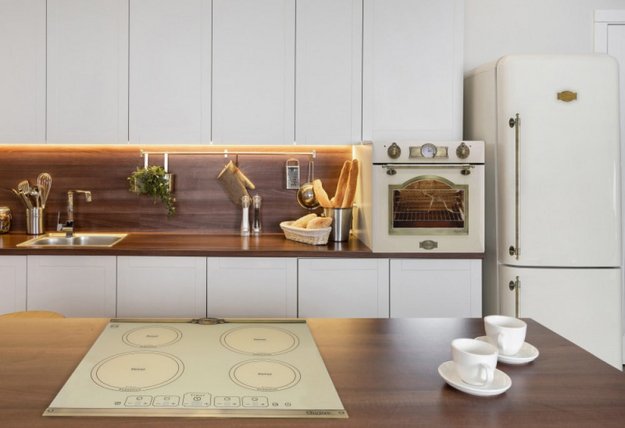 Если ваша кухня оборудована в классическом стиле, то в ней будет уместен в холодильник теплого бежевого цвета. Он хорошо подойдет к таким материалам, как натуральное дерево, текстиль, натуральный камень.