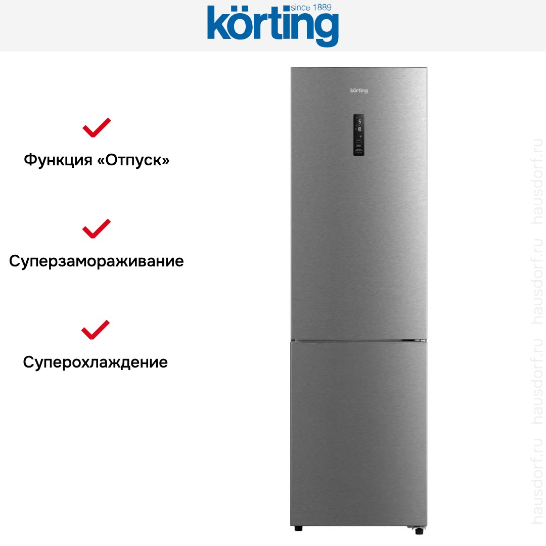 Холодильник Korting KNFC 62012 X — отдельно стоящий прибор высотой 201 см, шириной 59,5 см и глубиной 66 см. Металлическая лицевая панель придает строгий вид и легко выдерживает бытовые нагрузки. Скрытая ручка подчеркивает минималистичный дизайн. Дверцу можно перенавесить, чтобы она открывалась в другую сторону, для удобства расстановки мебели. Угол раскрытия 125° обеспечивает свободный доступ к содержимому. Регулируемые ножки помогают добиться ровного устойчивого положения прибора.
