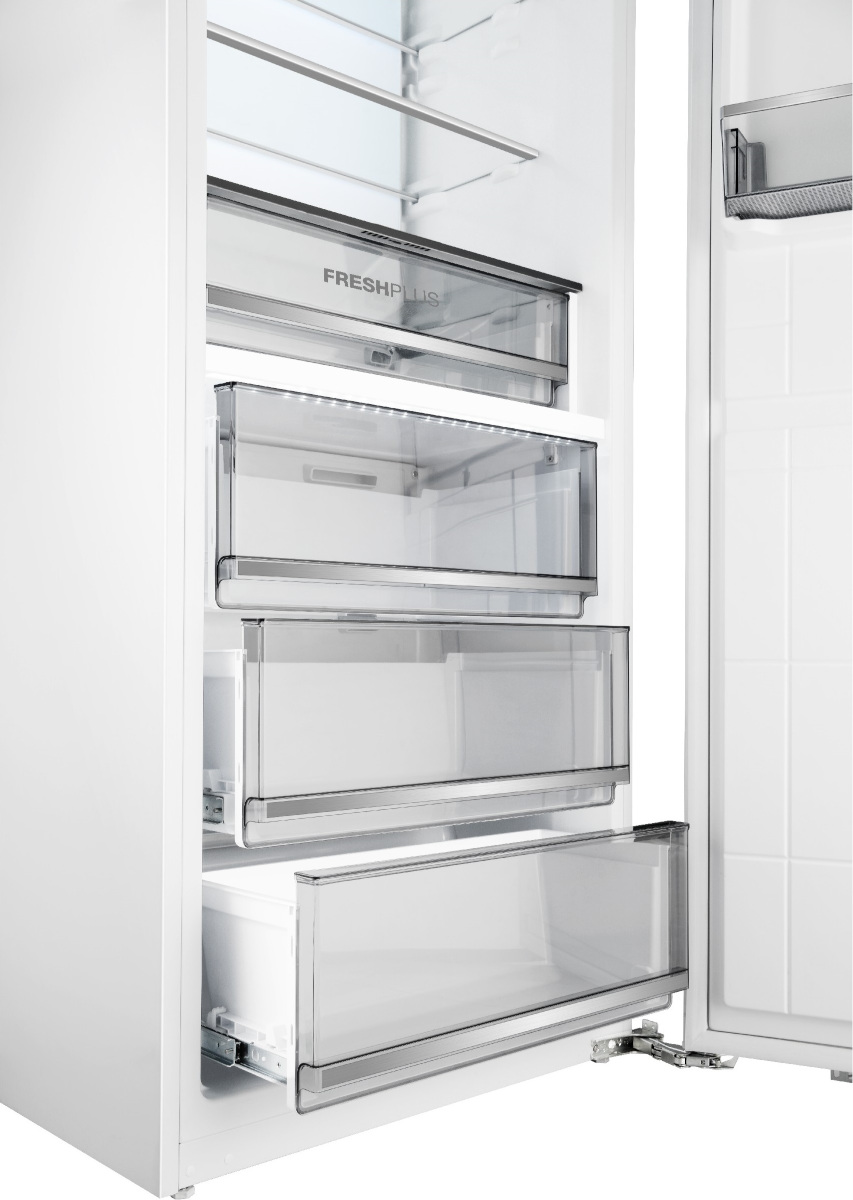 Встраиваемый прибор проще разместить в комнате, даже если общий метраж не такой уж большой. Вы можете спрятать его за декоративной панелью от мебельного фасада — советуем заранее определить нишу и заказывать панели исходя из типа крепления к двери. Способ монтажа в данной модели: скользящее крепление двери (система door sliding) Благодаря внушительным размерам, в частности высоте, она подходит большим пространствам — просторной кухне, еврогостиной. Вы можете поменять направление открывания двери, так как упор переставляемый и ее можно перевесить на другую сторону. Такая функция открывает больше возможностей для установки. Холодильник без морозильной камеры имеет свои преимущества: больше места для хранения продуктов краткого срока годности, разнообразие полок и ящиков для овощей, фруктов, молочных изделий. Количество камер: 1.