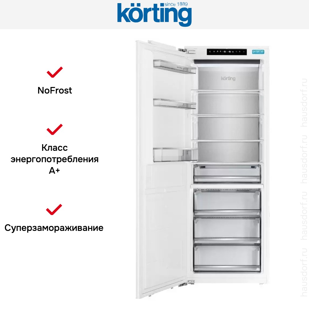 Морозильник Korting KSFI-1955 — встроенный агрегат с панельной фасадной отделкой, который легко интегрируется в любую кухонную композицию и сохраняет лаконичный вид мебельного ряда. Его габариты 193.7×69×55 см и предусмотренная ниша 194.2×71.2×56 см позволяют установить прибор в типовой шкаф без дополнительных переделок. Жёсткая система крепления door on door обеспечивает плотную стыковку фасадной панели и ровную фронтальную плоскость. Возможность перевешивания дверцы и правый дверной упор дают гибкость при монтаже, а регулируемые ножки упрощают выравнивание на неровном полу.