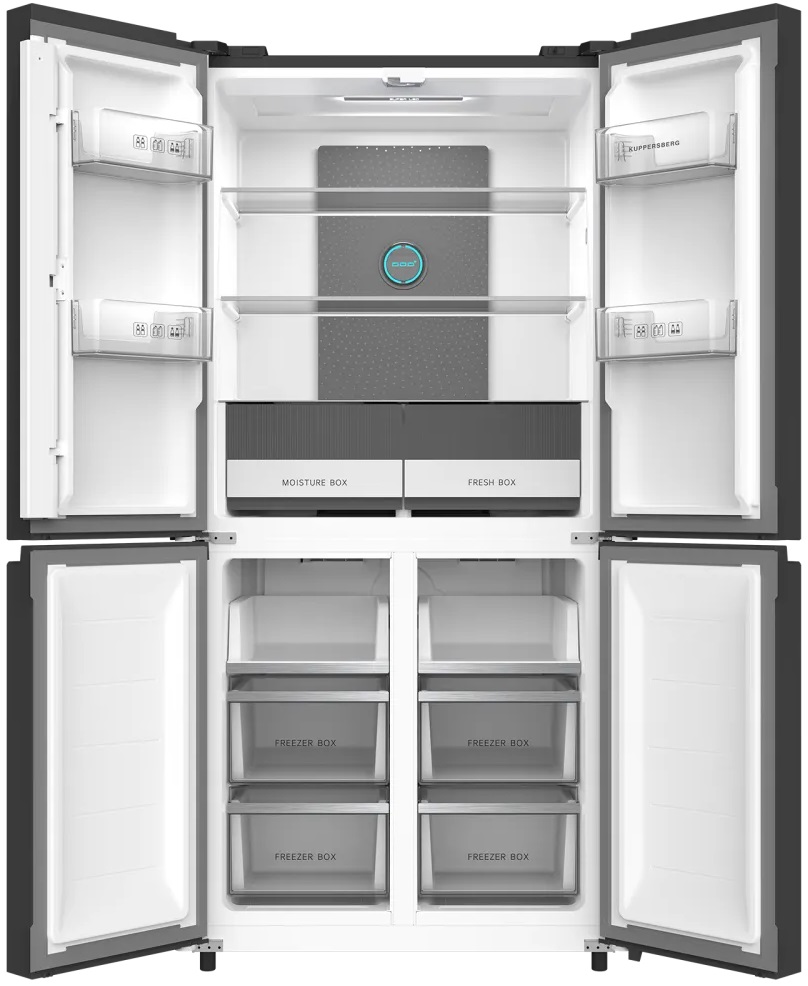 Kuppersberg NFFD 186 DX — стильный и вместительный прибор, созданный для тех, кто ценит продуманный дизайн и технологичность. Этот современный агрегат в корпусе из нержавеющей стали с черными вставками и четырьмя дверями предлагает оптимальные габариты 182.2×83×64.7 см и аккуратно вписывается в интерьер за счёт лаконичной внешности и ровных линий. Конструкция с нижним расположением морозильного отделения обеспечивает удобный доступ к часто используемым продуктам в основном отсеке, где размещается 303 литра полезного пространства: стеклянные полки, в том числе две регулируемые и одна фиксированная, позволяют гибко организовать хранение, а четыре полки на дверце и специальная подставка для яиц упрощают размещение бутылок, соусов и мелких упаковок. Для сохранения свежести предусмотрена отдельная зона «Fresh» с двумя контейнерами, идеально подходящая для овощей, фруктов и деликатных продуктов, а функция суперохлаждения быстро приводит температуру к оптимальным значениям при загрузке новых продуктов. Морозильный блок объёмом 172 литра оснащён двумя полками и четырьмя выдвижными ящиками, дополнен лотком для кубиков льда и поддерживает диапазон от −15°C до −24°C с функцией интенсивной заморозки; производительность замораживания достигает 8 кг в сутки, а система No Frost в обеих секциях устраняет необходимость ручного оттаивания и обеспечивает равномерное распределение холода. Управление интуитивное: электронная панель с сенсорными кнопками и цифровым дисплеем позволяет точно задавать температуру и активировать дополнительные режимы, при этом инверторный компрессор обеспечивает экономичную работу и долговечность, используя экологичный хладагент R600a и циркуляционную схему охлаждения для стабильного микроклимата. Прибор соответствует климатическому классу ST и классу энергоэффективности A++, что означает умеренное потребление электроэнергии при высокой производительности; уровень шума на рабочем режиме составляет 41 дБ, что делает эксплуатацию почти бесшумной. Практичные решения включают светодиодную подсветку внутреннего пространства, регулируемые ножки для устойчивого монтажа на неровной поверхности, звуковую индикацию открытой двери и детскую блокировку для безопасности семьи. Благодаря комбинированию внушительного общего объёма в 475 литров, продуманной планировки полок и ящиков, современным средствам управления и надёжному инверторному компрессору этот аппарат станет центральным элементом кухни, способным обеспечить длительное хранение продуктов в оптимальных условиях при минимальном участии пользователя.