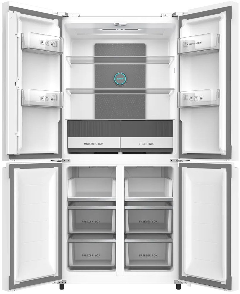 Холодильник Kuppersberg NFFD 186 WG представляет собой продуманное сочетание элегантного современного оформления и продвинутых технических решений, способных обеспечить долгую сохранность продуктов и комфорт в повседневном использовании. Эстетика корпуса в белом исполнении и глянцевый стеклянный фронт делают устройство вписывающимся в разные интерьеры, при этом строгие геометрические линии габаритов 182.2×83×64.7 см подчеркивают солидность и статусность кухни. Конструкция с нижней морозильной камерой и практичным распределением четырех дверей обеспечивает удобный доступ к свежим продуктам без лишней траты пространства, а система открывания Side-by-Side делает эксплуатацию плавной и эргономичной. Внутреннее пространство рассчитано на общий полезный объем 475 л: просторная холодильная зона вместимостью 303 л организована тремя стеклянными полками, две из которых регулируемые, и четырьмя отсеками на двери, включая лоток для яиц, что облегчает систематизацию запасов. Зона свежести с двумя контейнерами предназначена для хранения овощей, фруктов и деликатных продуктов при оптимальной влажности и температуре, а функция суперохлаждения оперативно понижает температуру при загрузке большого количества товаров. Морозильная секция объемом 172 л оборудована двумя полками и четырьмя выдвижными ящиками для удобного разделения продуктов по категориям; наличие лотка для приготовления кубиков льда и опции суперзамораживания делает её универсальной для бытовых нужд, а показатель производительности замораживания 8 кг/сутки свидетельствует о надежности при активной эксплуатации. Оба отделения работают по технологии No Frost, что исключает образование наледи и снижает необходимость ручного размораживания, обеспечивая стабильность параметров хранения. Управление полностью электронное: сенсорные кнопки и цифровой дисплей позволяют точно регулировать температуру в диапазоне от −15°C до −24°C в морозильнике и легко контролировать режимы, при этом предусмотрена функция индикации открытой двери со звуковым сигналом и защита от детей для безопасной эксплуатации в семье. Инверторный компрессор на базе одного компрессорного блока гарантирует экономичное энергопотребление класса A++, уменьшенный уровень шума до 41 дБ и надежную работу в широком диапазоне условий, что подтверждается климатическим классом ST. Циркуляционная система охлаждения обеспечивает равномерное распределение холодного воздуха по полкам, а светодиочная подсветка внутри холодильной камеры делает обзор содержимого комфортным и энергосберегающим. Практичные детали, такие как регулируемые ножки для точной установки по уровню пола, возможность тонкой регулировки температурных режимов и инертный хладагент R600a, дополняют картину современной бытовой техники, ориентированной на долговечность и удобство повседневного использования, что делает этот агрегат привлекательным выбором для семей, ценящих вместительность, технологичность и лаконичный дизайн.