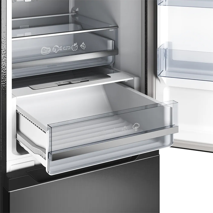 Специальная зона свежести предназначена для правильного и более длительного хранения овощей, фруктов, зелени. В ней поддерживается околонулевая температура, поэтому продукты не перемораживаются и не пересыхают. Система охлаждения этого холодильника — циркуляционная .
