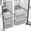 Интерьер организован для максимального комфорта и логики хранения. Общий объём 642 л распределён между холодильной камерой 372 л и морозильной 270 л, что удобно для больших семей и запасов. В холодильной части четыре стеклянные полки, три из которых регулируются по высоте, и один фиксированный уровень для тяжёлых емкостей. Два больших овощных ящика сохраняют влажность продуктов, а на дверце находятся четыре практичные полки и подставка для яиц.