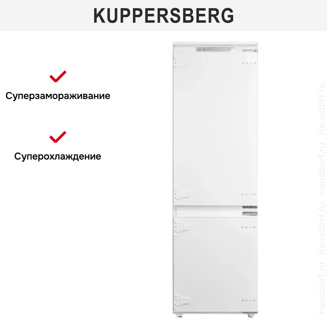 Встраиваемый холодильник KUPPERSBERG RBN 1761 — это сочетание аккуратного внешнего вида и продуманной внутренней организации, подходящее для современных кухонь, где важны эстетика и функциональность. Корпус рассчитан под встраивание в нишу стандартных размеров, габариты прибора позволяют разместить его даже в ограниченном пространстве при условии соблюдения рекомендованных параметров установки; монтаж реализован с системой door sliding, допускающей перевешивание двери и адаптацию под фасад ваших модулей, что делает это решение универсальным для разных интерьеров и полностью интегрируемых кухонных зон. Дизайн ориентирован на минимализм: аккуратная фронтальная панель остаётся невидимой под навесом фасада, а внутренняя планировка выполнена так, чтобы обеспечить лёгкий доступ к запасам и оптимальную циркуляцию прохлады по всем отсекам. Внутри располагаются четыре стеклянные полки, три из которых регулируются по высоте, удобная подставка для бутылок и три полки на дверце, обеспечивающие гибкость размещения посуды и продуктов, а также отдельный большой ящик и два отдела для фруктов и овощей, которые сохраняют свежесть благодаря антибактериальному покрытию и равномерному температурному распределению. Холодильная камера оборудована светодиодной подсветкой, которая равномерно освещает все зоны, а сенсорное электронное управление с дисплеем делает настройку параметров понятной и быстрой; доступны опции регулировки температуры и режим «Отпуск» для длительного отсутствия, а звуковая индикация открытой двери подскажет о необходимости вмешательства. Технологическая составляющая включает инверторный компрессор с низким уровнем шума (всего 35 дБ), экологичный хладагент R600a и класс энергопотребления A++, что гарантирует экономичный расход электроэнергии и длительную работу без лишнего шума. Морозильная камера расположена внизу и имеет объём 76 литров, разбитый на три выдвижных ящика, которые упрощают хранение замороженных продуктов и позволяют быстро находить нужное; функция суперзамораживания защищает качество и структуру заготовок, а лоток для льда обеспечивает удобное приготовление кубиков. Оба отделения оснащены системой No Frost, исключающей необходимость ручного размораживания и предотвращающей образование наледи, что снижает обслуживание и продлевает срок службы. Общий полезный объём составляет 274 литра, из которых 198 литров приходится на холодильную часть, а автономное сохранение холода обеспечивает до 8 часов без электропитания, что важно для непредвиденных ситуаций. Класс климатической устойчивости T гарантирует стабильную работу при тёплых температурах помещения, а циркуляционная система охлаждения обеспечивает равномерность микроклимата по объёму камер. Эргономика дополнена подставкой для яиц, удобными ручками и прочной конструкцией полок, а габариты ниши для встраивания и точные внешние размеры делают выбор и установку прогнозируемыми и простыми. Этот прибор прекрасно впишется в современную кухню, ориентированную на функциональность и аккуратный внешний вид, обеспечивая эффективное хранение, бережную обработку продуктов и комфортное управление. холодильники Kuppersberg RBN 1761 холодильники Kuppersberg RBN 1761