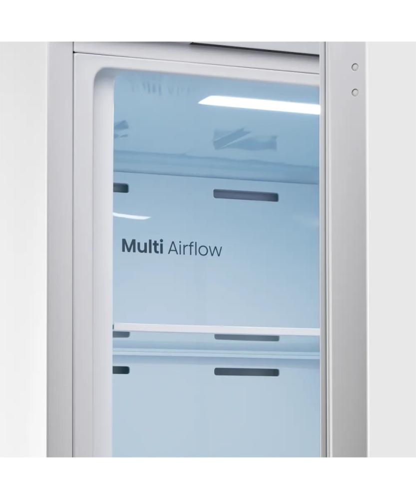 Специальная зона свежести предназначена для правильного и более длительного хранения овощей, фруктов, зелени. В ней поддерживается околонулевая температура, поэтому продукты не перемораживаются и не пересыхают. Система охлаждения этого холодильника — Multi-Airflow-System.
