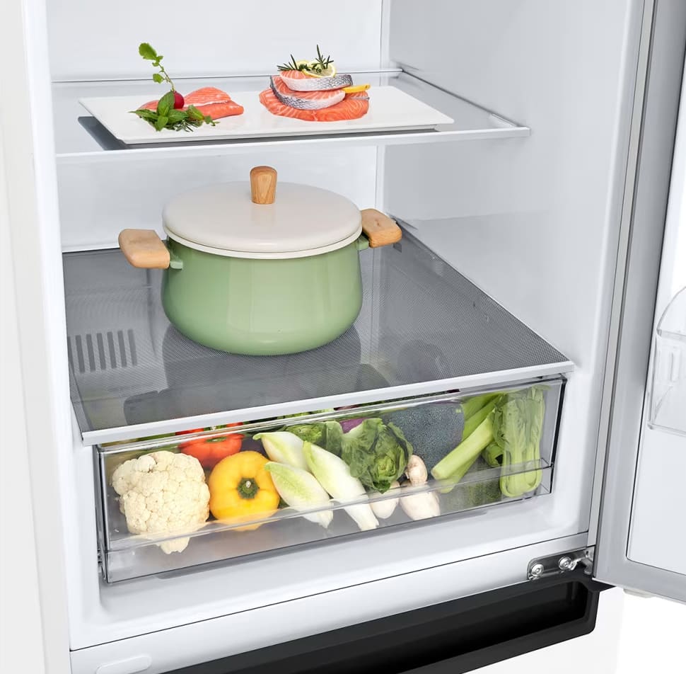 Ящики для продуктов изготавливаются либо целиком из прозрачного пластика, либо часто имеют переднюю прозрачную панель, которая обеспечивает лучший обзор. Полки в большинстве холодильников могут перемещаться по высоте, устанавливаются на специальных направляющих и без труда снимаются для очистки.
