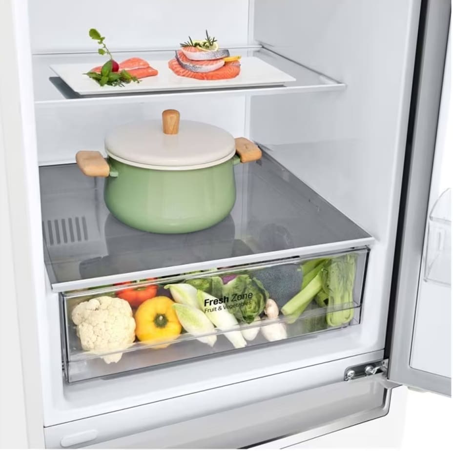 Холодильник LG GC-B459SQCL — это отдельно стоящая двухкамерная модель с продуманным эргономичным дизайном. Белый металлический фасад выглядит аккуратно и легко впишется в кухонную обстановку, не привлекая лишнего внимания. Скрытая ручка сохраняет чистоту линий, а металл корпуса гарантирует прочность и простоту ухода.