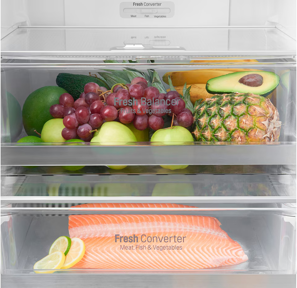 Вместительные контейнеры позволяют хранить достаточное количество овощей и фруктов. Для более длительного хранения и поддержания свежести овощей и фруктов разработаны специальные системы хранения. Среди них, например, зона свежести с увеличенной влажностью до 85% и температурой около 0 градусов. Это герметично закрывающийся ящик, часто на выдвижных роликах или направляющих, в котором имеется специальное задвижка, позволяющая регулировать влажность. Как известно, при более высокой влажности продукты с большим содержанием воды дольше остаются свежими.