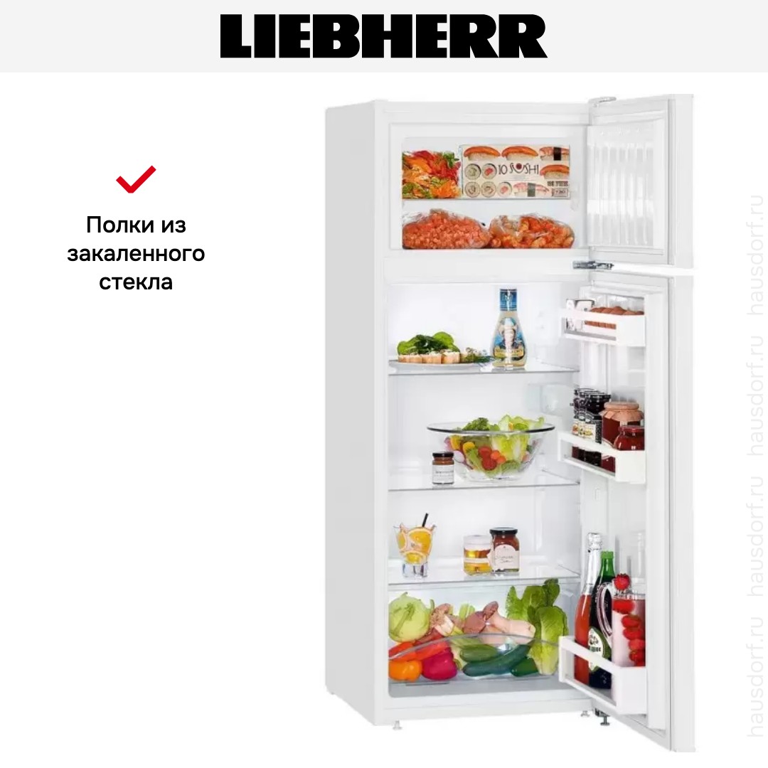 Холодильник Liebherr CT 2531 оборудован полками из закалённого стекла в обоих отделениях. Этот материал отличается устойчивостью к механическим повреждениям. Система SmartFrost препятствует образованию инея на замороженных продуктах и стенках прибора.