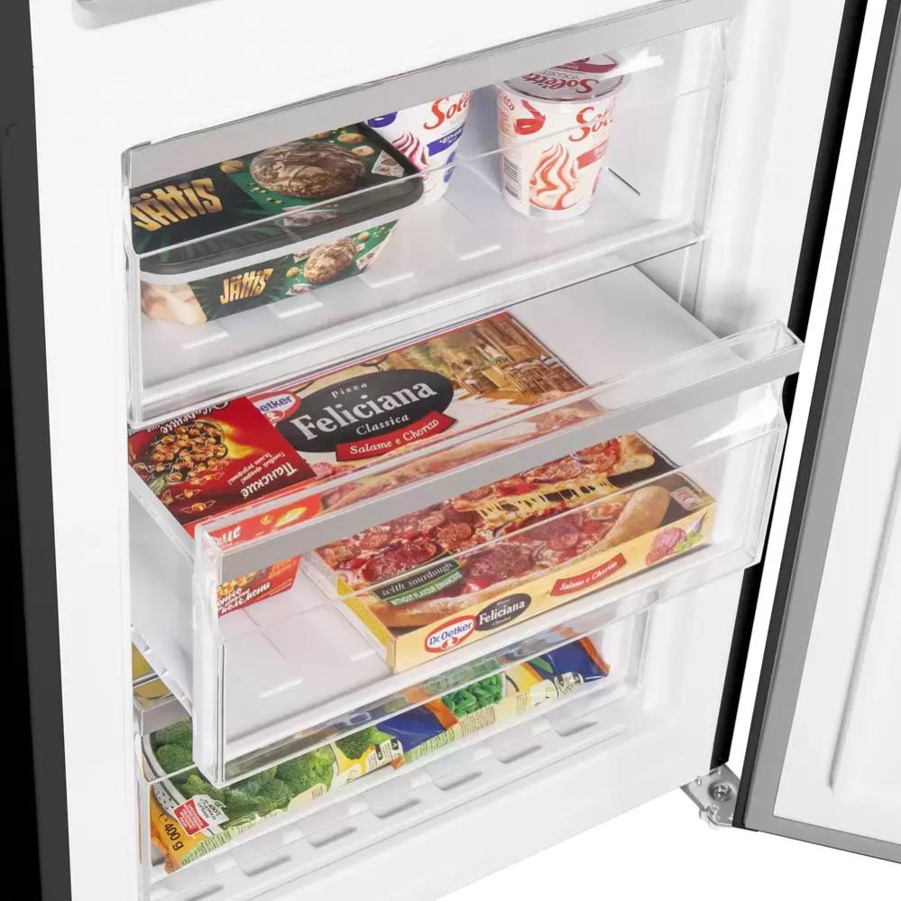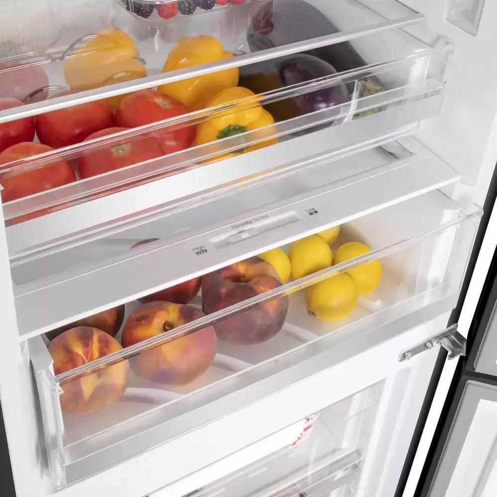 Внутреннее пространство организовано рационально: общий объем 340 литров включает холодильную камеру на 240 литров и морозильник на 100 литров снизу. В холодильной части три полки из закаленного стекла выдерживают тяжёлые кастрюли и вместительные блюда, при этом поверхность легко очищается. На дверце располагаются четыре удобных кармана для бутылок и соусов, а также есть большой лоток и два ящика для овощей и фруктов для аккуратного хранения и поддержания оптимальной влажности.