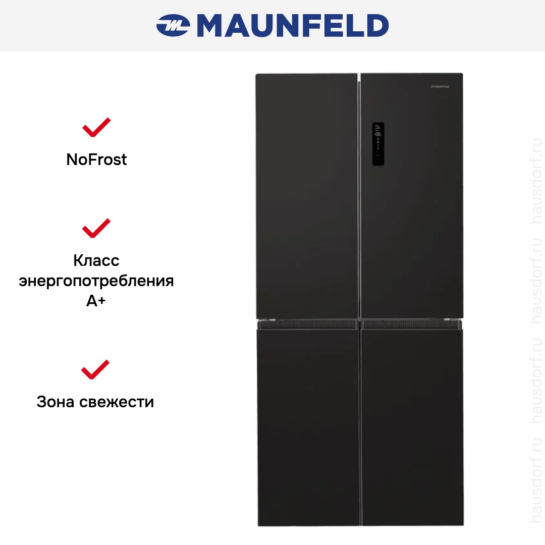 Холодильник Maunfeld MFF190NFSB01 — отдельностоящий холодильник с морозильной камерой снизу и дверным упором French Door. Дизайн выполнен в оттенке «черная сталь», что придаёт технике строгий и современный вид. Четыре двери и продуманные пропорции делают устройство выразительным акцентом на кухне. Габариты 190,5×83,2×65 см обеспечивают вместительность без чрезмерной громоздкости.