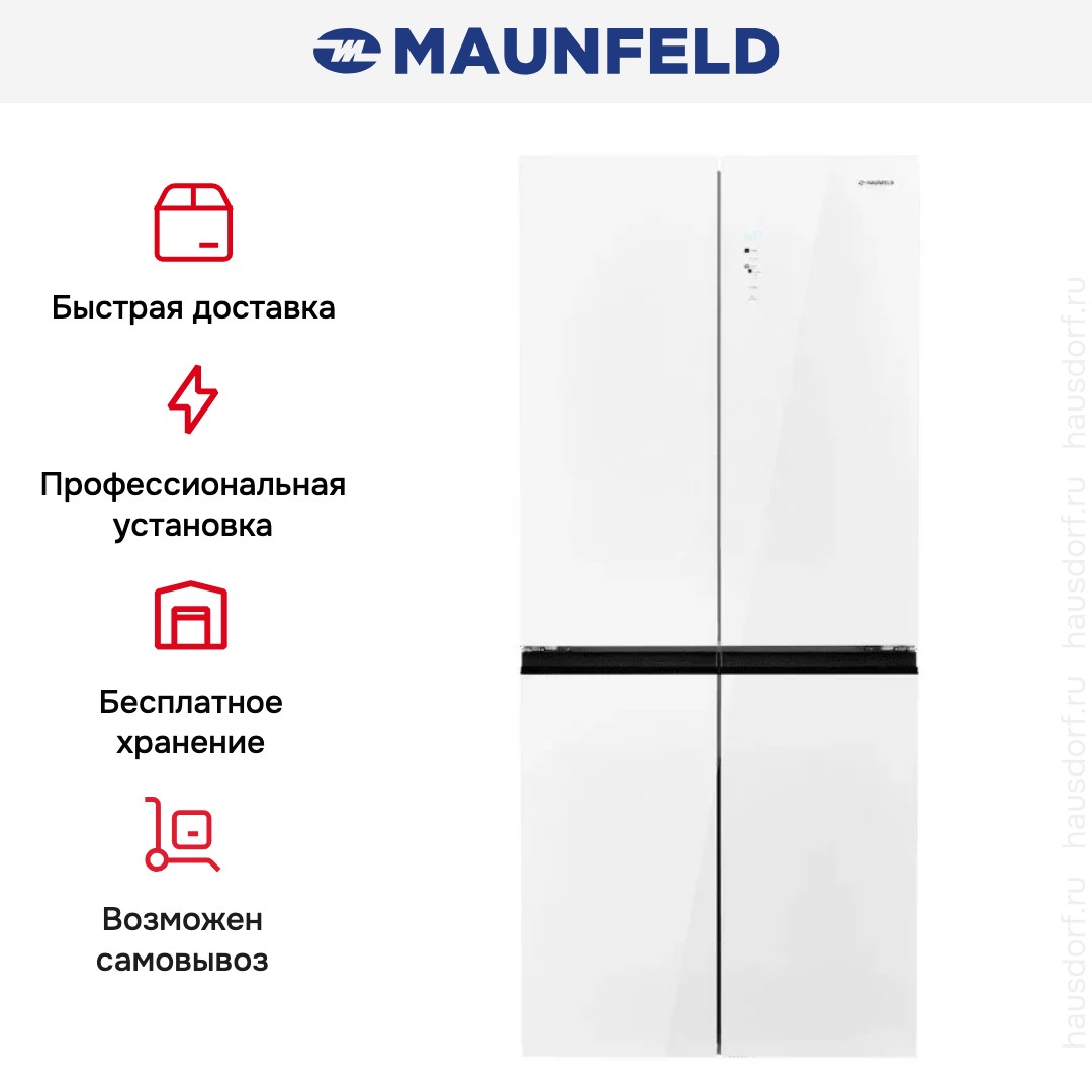 Холодильник Maunfeld MFF192NFPW01 Inverter сочетает внушительный объём и продуманный формат French Door в аккуратном белом исполнении.