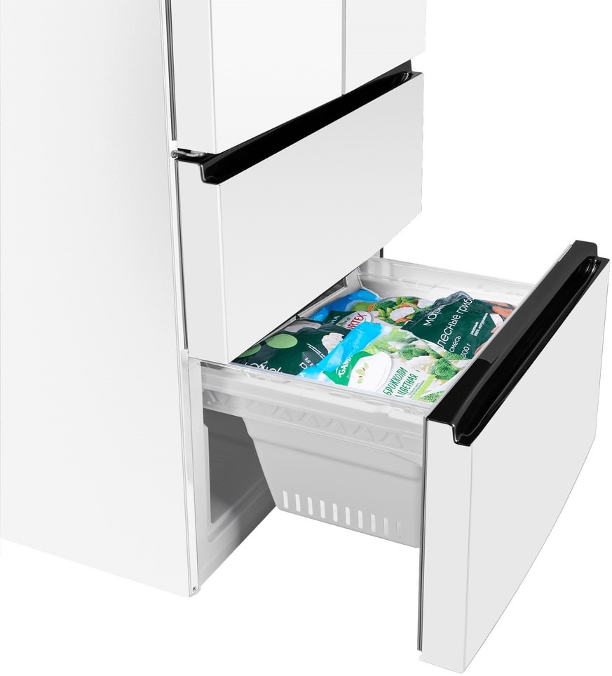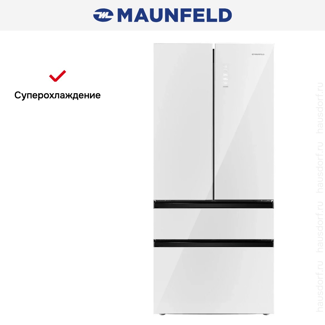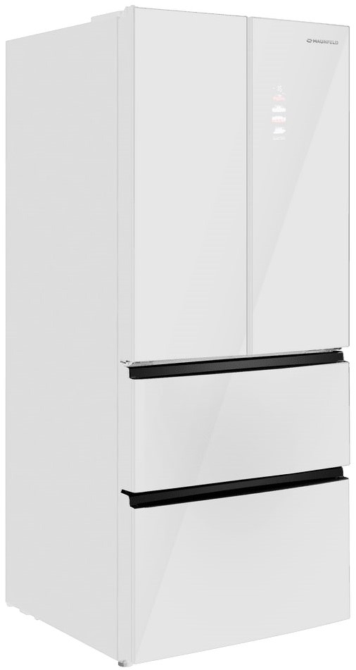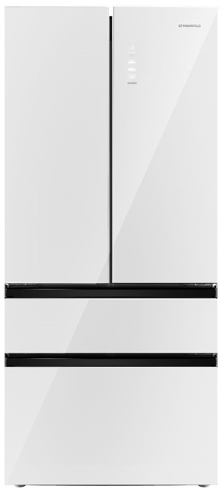Холодильник Maunfeld MFF190NFD PW01 — отдельно стоящий двухкамерный агрегат необычной конструкции French Door. Холодильное отделение располагается сверху и имеет две створки дверей, а морозильник находится снизу и включает два выдвижных ящика. Габариты прибора 190,5×83×60 см делают его удобным для кухонь средней и большой площади. Общий полезный объем 508 литров обеспечивает комфортное хранение запасов на большой срок для семьи.