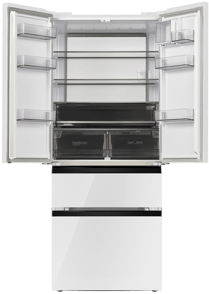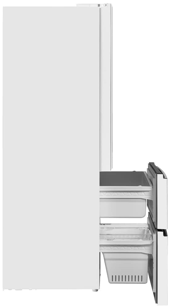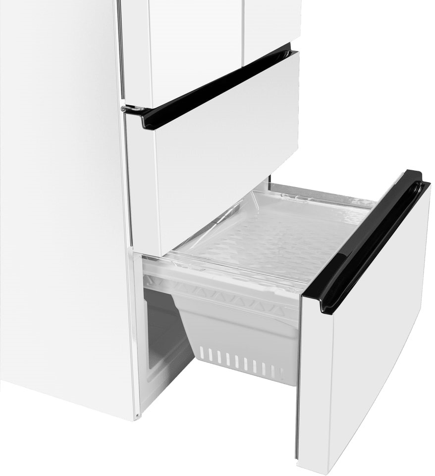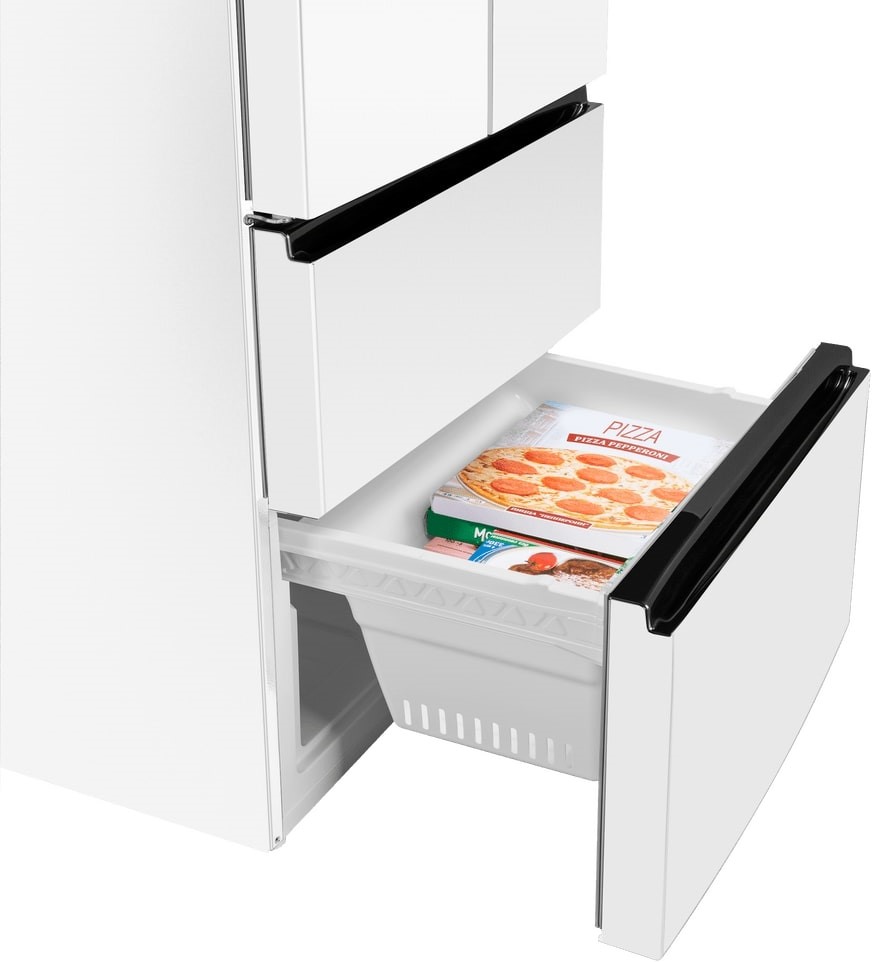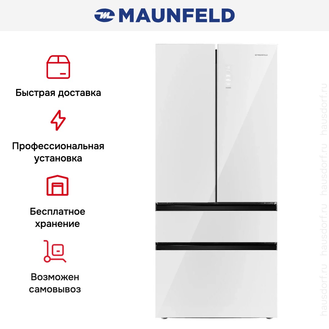 Холодильник Maunfeld MFF190NFD PW01 — отдельно стоящий двухкамерный агрегат необычной конструкции French Door. Холодильное отделение располагается сверху и имеет две створки дверей, а морозильник находится снизу и включает два выдвижных ящика. Габариты прибора 190,5×83×60 см делают его удобным для кухонь средней и большой площади. Общий полезный объем 508 литров обеспечивает комфортное хранение запасов на большой срок для семьи.