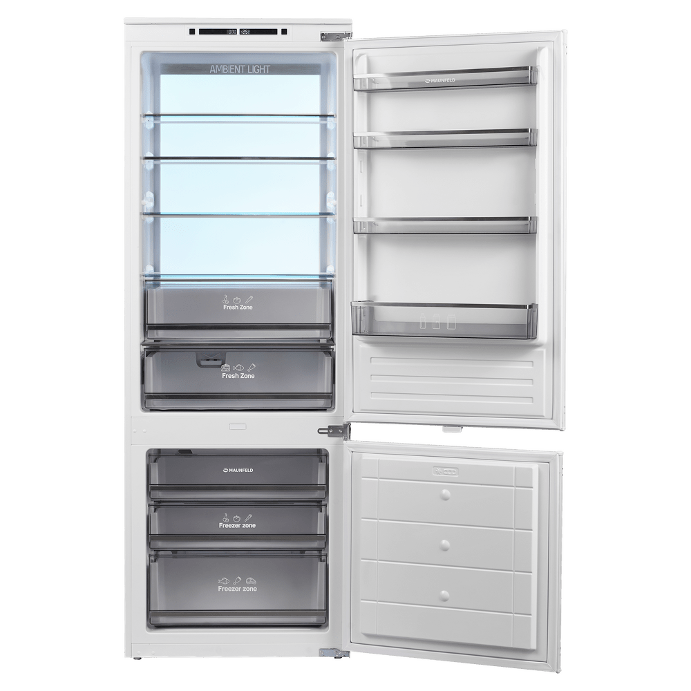 Встраиваемый холодильник Maunfeld XMBF193NFW1GR Inverter сочетает в себе строгий внешний вид и продуманное оснащение. Корпус рассчитан на монтаж в нишу 194.1×71×56 см. Дверь по умолчанию закреплена справа, но конструкция допускает перевешивание, что упрощает подгонку под планировку. Жесткое крепление системы door on door обеспечивает плотное и аккуратное прилегание декоративной панели к фасаду.