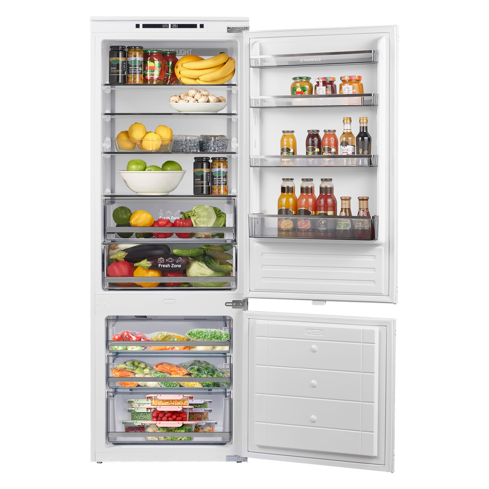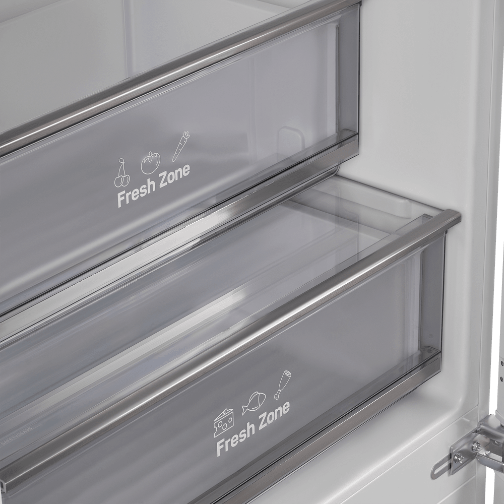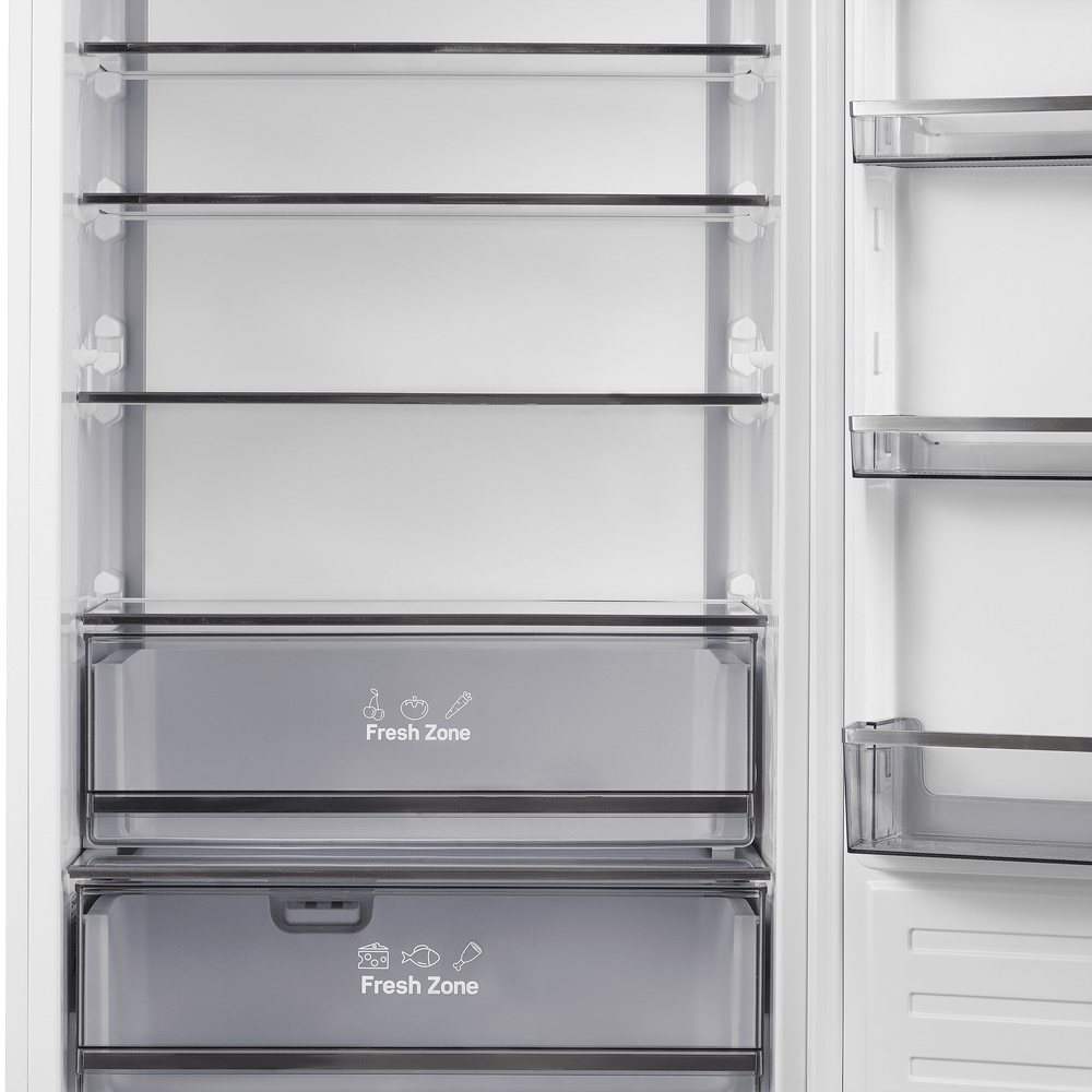 Внутреннее пространство организовано так, чтобы облегчить хранение продуктов и ежедневный доступ к ним. Общий полезный объём составляет 341 л, из которых 257 л приходится на холодильную зону и 84 л на морозильник внизу. В холодильной камере имеются четыре полки из закаленного стекла, которые способны выдерживать тяжелые емкости и легко очищаются. На дверце есть место для напитков соусам. Зона свежести служит для хранения овощей и мясных изделий, что позволяет сберечь их текстуру и вкус дольше обычного.