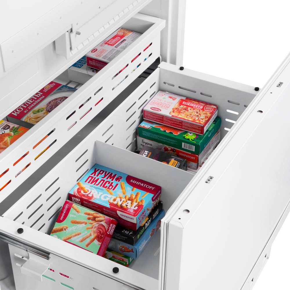 Внутреннее пространство организовано продуманно: общий полезный объем 556 литров, включая 399 литров в основной камере и 157 литров в морозильном отделении. Для хранения предусмотрены три полки из закаленного стекла и три полки на дверце, что дает возможность удобно расположить запасы. В морозилке есть два выдвижных ящика и лоток для льда.