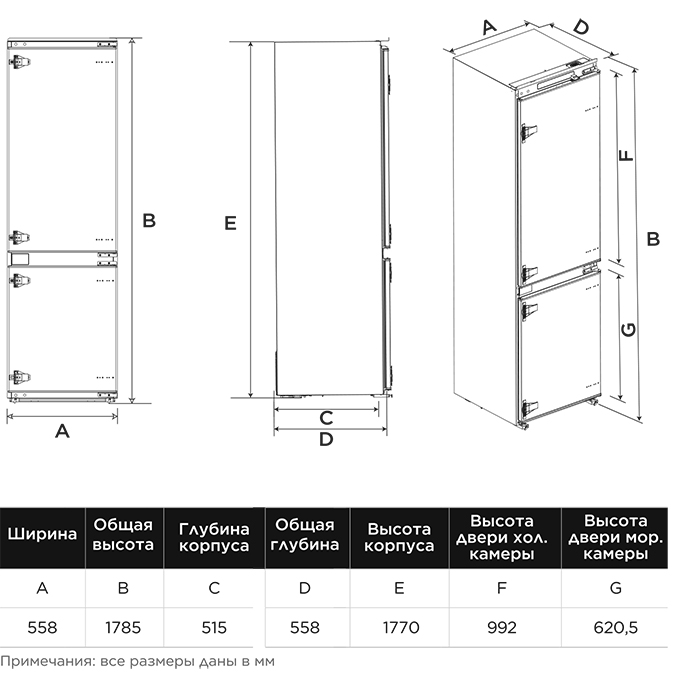 Встраиваемый прибор проще разместить в комнате, даже если общий метраж не такой уж большой. Вы можете спрятать его за декоративной панелью от мебельного фасада — советуем заранее определить нишу и заказывать панели исходя из типа крепления к двери. Способ монтажа в данной модели: жесткое крепление (система door on door) Вы можете поменять направление открывания двери, так как упор переставляемый и ее можно перевесить на другую сторону. Такая функция открывает больше возможностей для установки. Холодильник с морозильником обладает всеми опциями, которые чаще всего ищут и выбирают покупатели. Стандартная конфигурация — универсальный вариант для любой квартиры. Количество камер: 2.