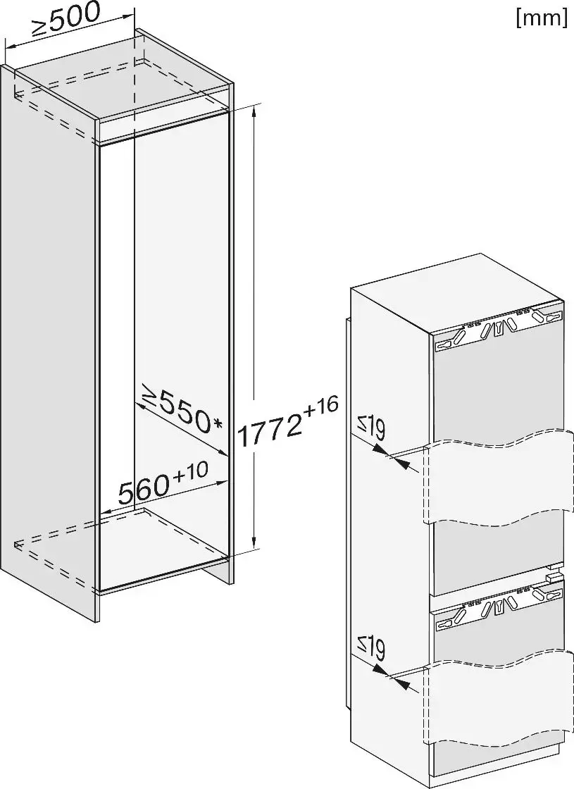 Встраиваемый холодильник Miele KFN 7744 C рассчитан на установку в мебельную нишу под навес декоративного фасада. Это позволяет сделать скрыть технику и сделать интерьер более цельным. Устройство высотой 177 см и шириной 55,9 см предназначено для ниши 177,2—178,8×56—57×55 см. Допустимый вес фронтальной панели до 18 кг по верхней двери и до 12 кг по нижней позволяет использовать плотные фасады без риска деформации.
