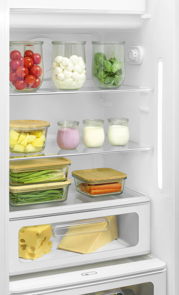 Вместительные контейнеры позволяют хранить достаточное количество овощей и фруктов. Для более длительного хранения и поддержания свежести овощей и фруктов разработаны специальные системы хранения. Среди них, например, зона свежести с увеличенной влажностью до 85% и температурой около 0 градусов. Это герметично закрывающийся ящик, часто на выдвижных роликах или направляющих, в котором имеется специальное задвижка, позволяющая регулировать влажность. Как известно, при более высокой влажности продукты с большим содержанием воды дольше остаются свежими.