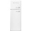 Smeg FAB30LWH5 — белый отдельно стоящий холодильник с дверным упором слева. Морозильная камера расположена сверху и способна сохранять холод при отключении электроэнергии на протяжении 30 часов. Полки в холодильной камере изготовлены из ударопрочного стекла и могут регулироваться по высоте.