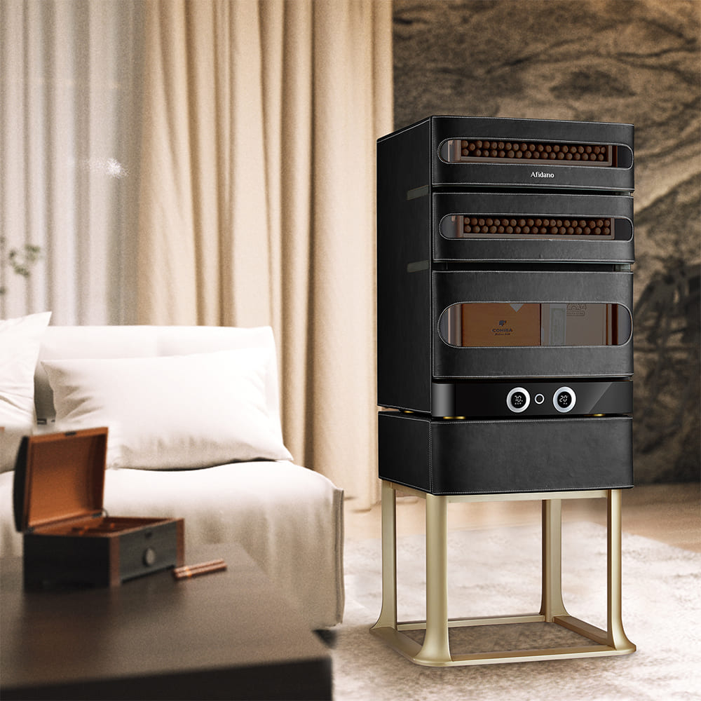 Установлен на воздуховоде, чтобы удалять примеси и запахи, которые могут нарушить выбранные условия хранения сигар.