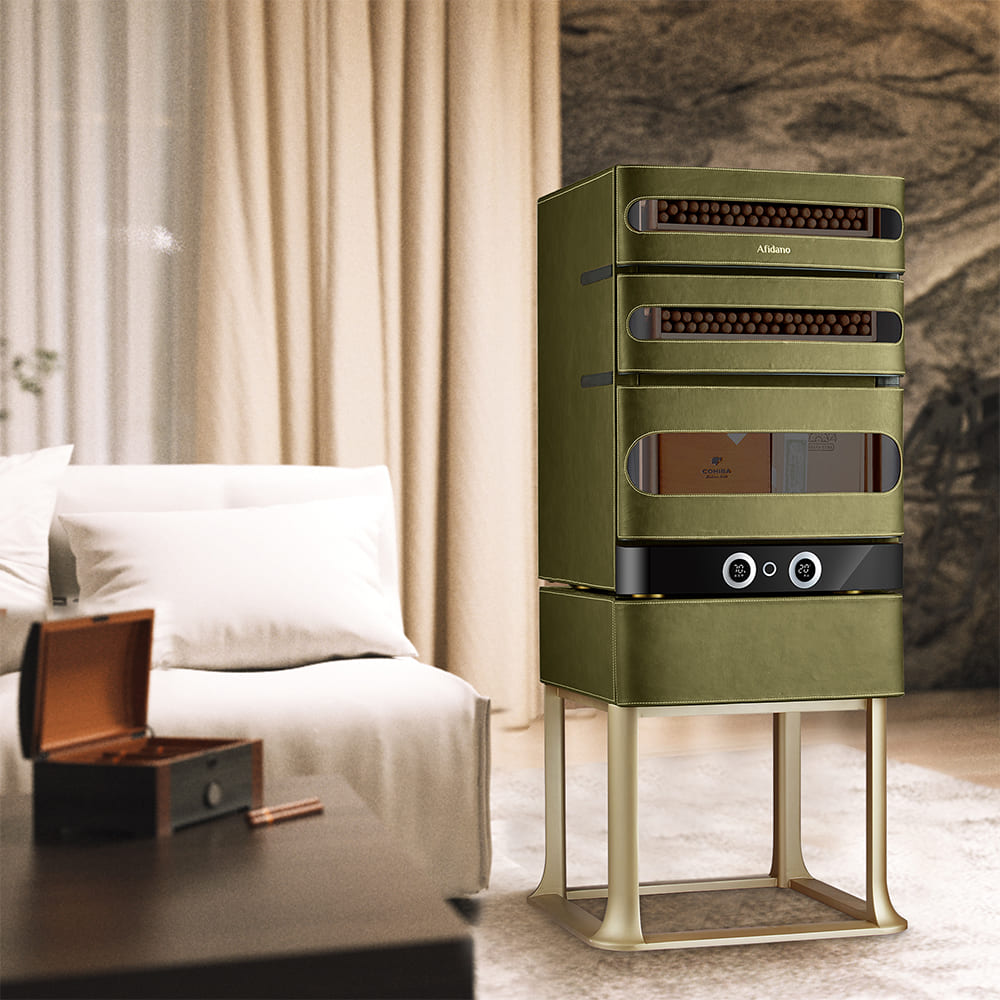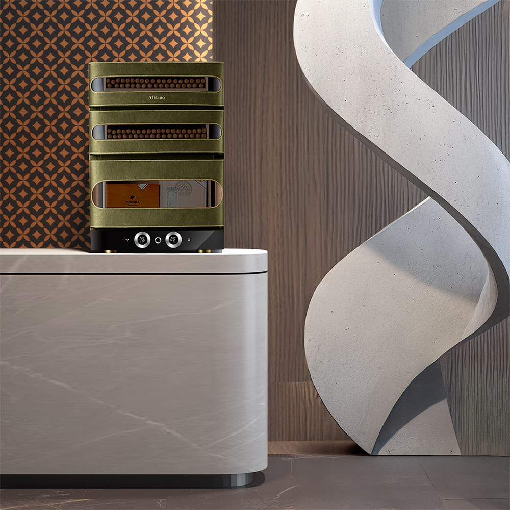 Установлен на воздуховоде, чтобы удалять примеси и запахи, которые могут нарушить выбранные условия хранения сигар.