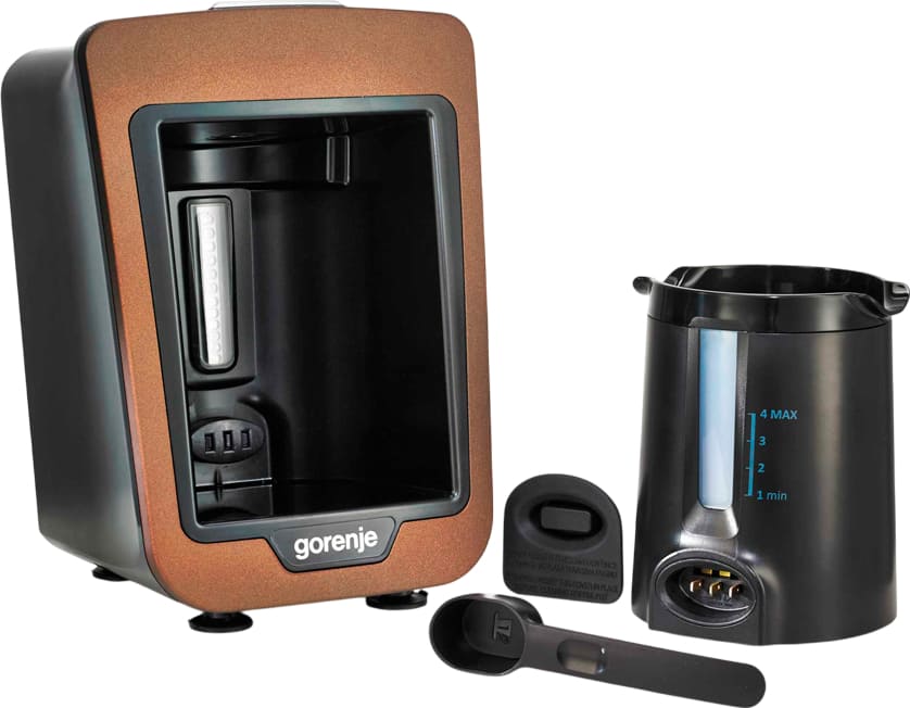 Кофеварка Gorenje ATCM730T — компактный прибор, который сочетает традиции приготовления в турке с современным удобством электрической техники. Корпус выполнен из прочного пластика коричневого цвета, а аккуратные габариты 24,5 × 17,5 × 21,5 см позволяют разместить устройство даже на небольшой кухне. Небольшой вес около 1,5 кг делает агрегат мобильным и простым в перемещении, а продуманная форма вписывается в разные стили интерьера.