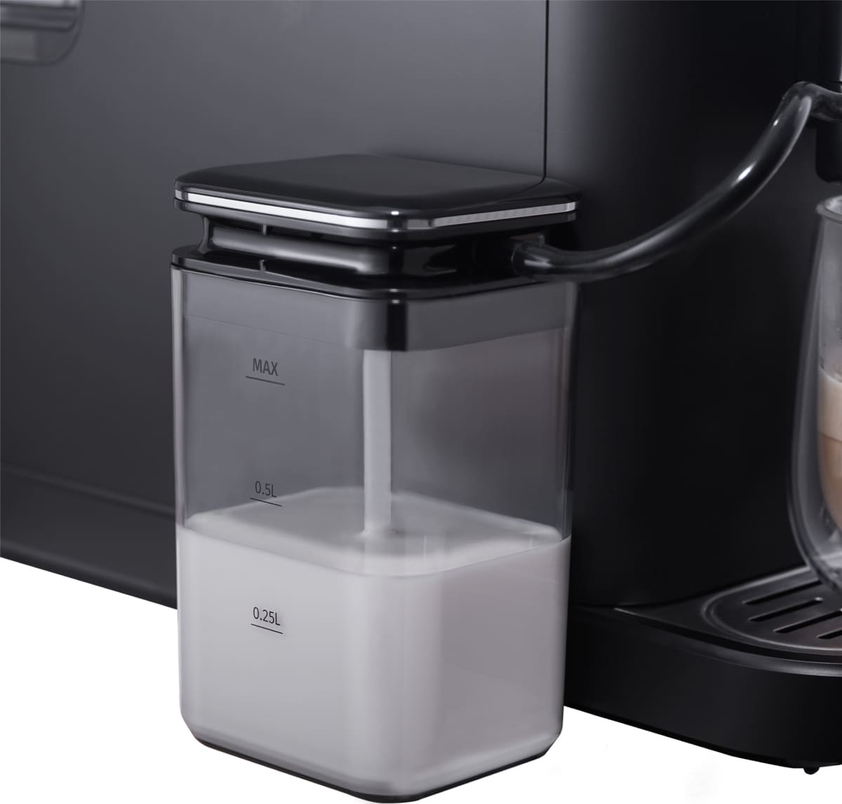 Съемный контейнер для молока в кофемашинах позволяет готовить латте или капучино, не боясь, что молоко испортится в стационарном резервуаре, а также гарантирует полностью автоматический процесс приготовления. Такой контейнер часто называют кувшином для молока благодаря характерной форме, удобной ручке и плотно прилегающей крышке. Контейнер можно легко извлечь сразу после приготовления напитка. Материал изготовления его — прозрачный экологически безопасный пластик. После извлечения контейнер можно хранить в холодильнике: как правило, использовать его следует в течение суток.